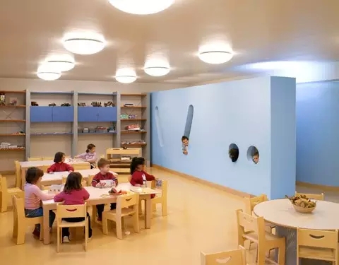 歐美國家的一些幼兒園由于在教育方式實行的是以幼兒為中心的教育手段,幼兒的活動區域具有很大的開放性,因此室內空間多為開放性空間,同時具有更大的流通靈活性,課堂活動上有分有合,布局組合隨意。界面分隔手法奇特,半墻等半通透甚至完全通透的多種類型的隔斷,空間具有較高的層次性,界面立體性較強,整體趣生高。