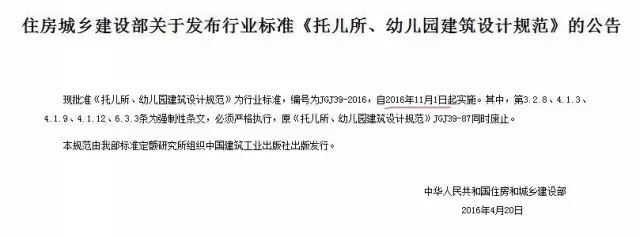 現(xiàn)批準(zhǔn)《托兒所、幼兒園建筑設(shè)計(jì)規(guī)范》為行業(yè)標(biāo)準(zhǔn),編號為JGJ 39-2016,自2016年11月1日起實(shí)施。其中,第3.2.8、4.1.3、4.1.9、4.1.12、6.3.3條為強(qiáng)制性條文,必須嚴(yán)格執(zhí)行,原《托兒所、幼兒園建筑設(shè)計(jì)規(guī)范》JGJ 39-87同時(shí)廢止。