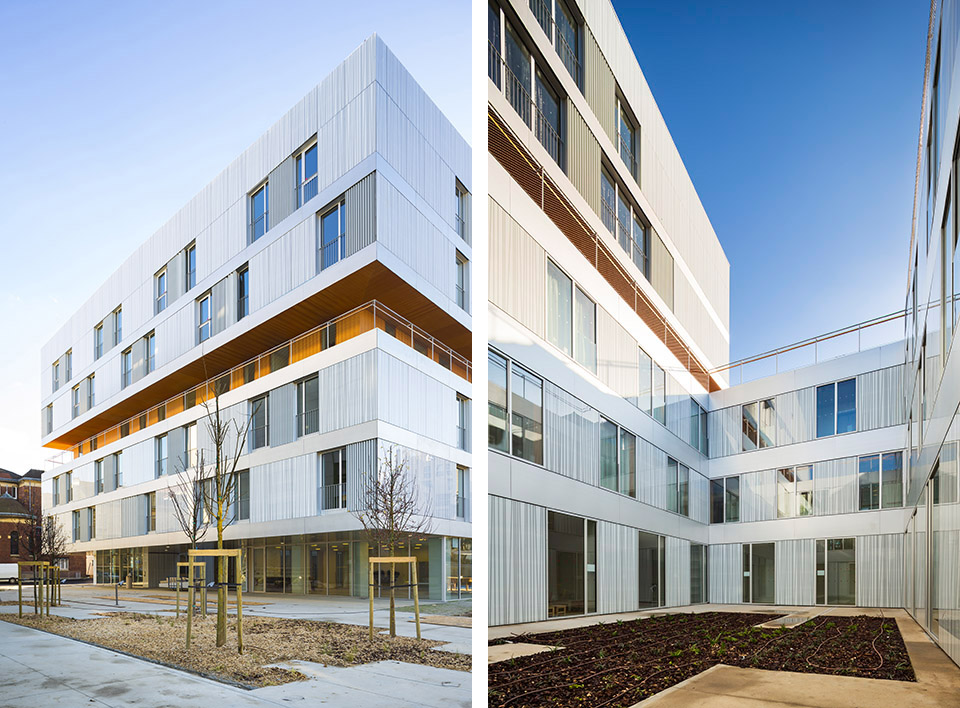 第四層體量向后回縮,形成舒適寬大的通廊。建筑有兩個內院。建筑是穿著細網狀物外觀形成一個保護層的穿孔金屬板統一設計,點綴和過濾,花園和露臺很容易通過大玻璃門,第四層通廊深暖色與建筑周身銀色外觀形成鮮明對比。