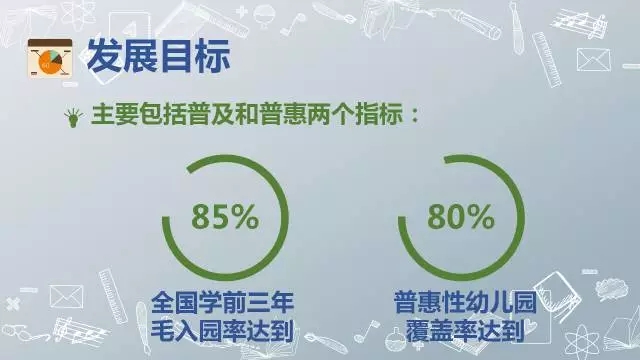 主要包括普及和普惠兩個指標:全國學前三年毛入園率達到85%、普惠性幼兒園覆蓋率(公辦幼兒園和普惠性民辦幼兒園在園幼兒數占在園幼兒總數的比例)達到80%左右,這是落實“十三五”規劃,實現學前教育基本普及、解決“入園難”“入園貴”的關鍵指標。